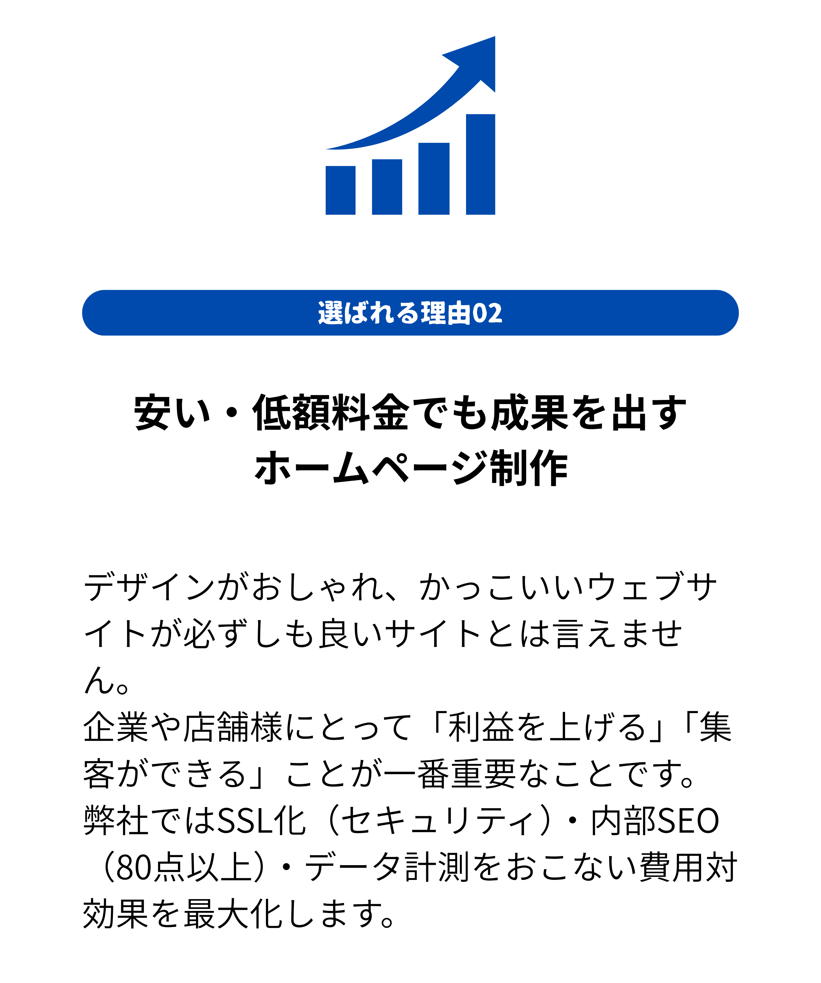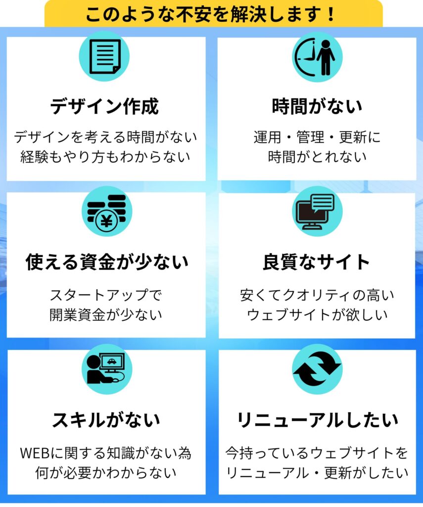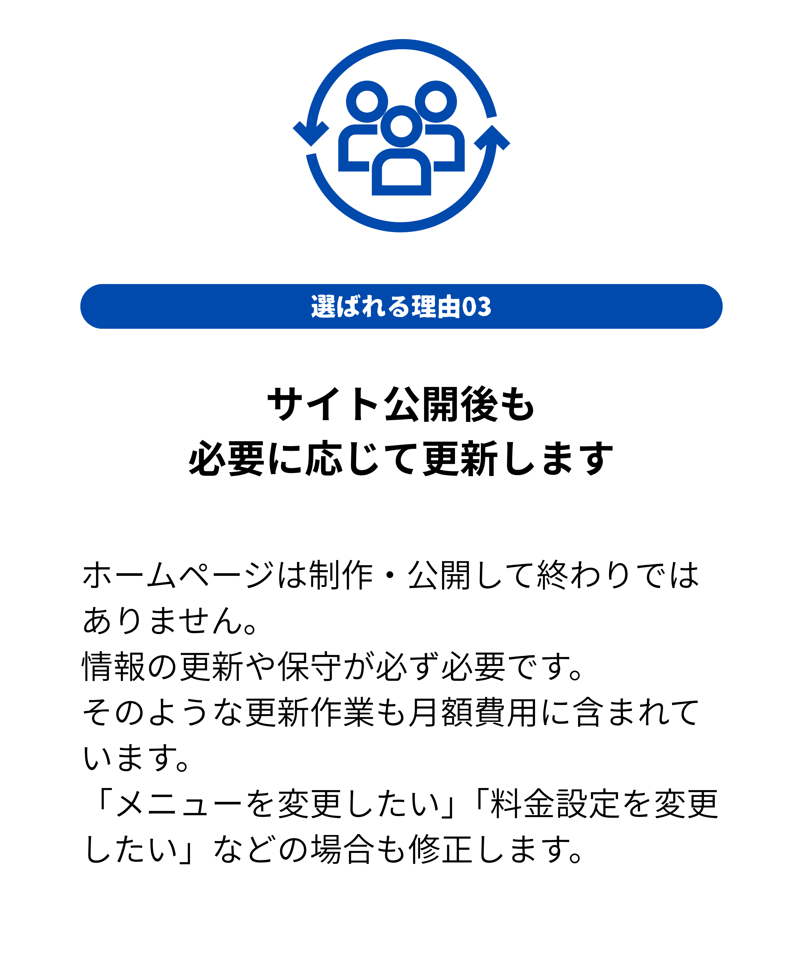 そこで私たちは、こうした課題を抱える企業様・店舗様のために、初期費用ゼロで利用できる、すべて込みのサブスクリプション(月額制)型ホームページ制作サービスをご用意しました。携帯電話の料金感覚で利用できる、手頃で続けやすいサービスです。