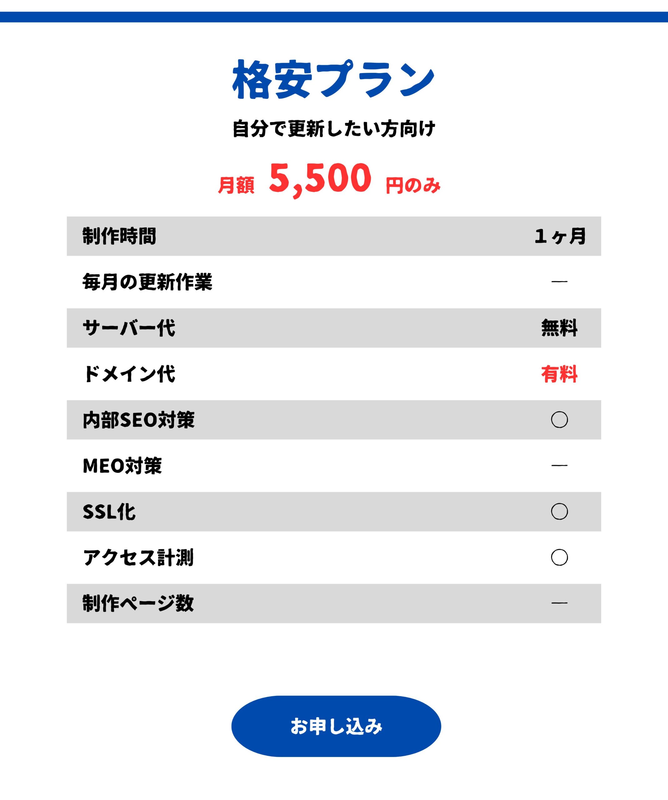 ※格安プランでは、2年目以降からドメイン費用(¥1500/年)をご請求させていただきます。